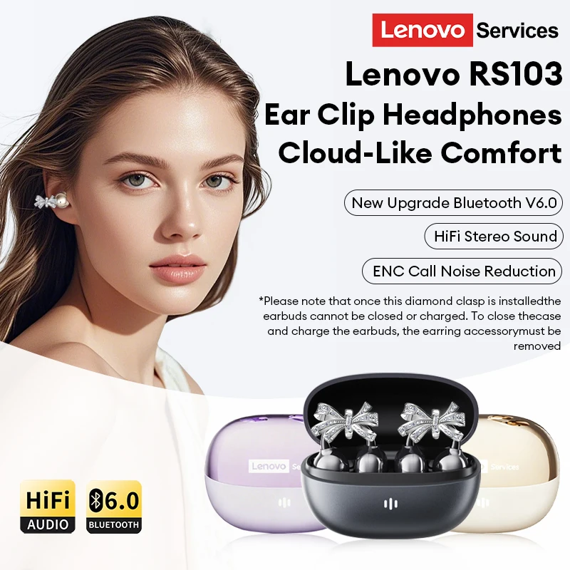 New Lenovo RS103 Wireless Bluetooth 6.0 Ear Clip Earphones 360° Surround Sound Headphones 24H Long Battery Life Earbuds for Mic $18.72